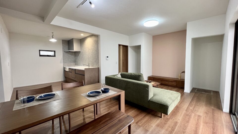 色を抑えた空間構成によって、家族の生活の気配が自然と主役になる、長く愛される内装に仕上げました。