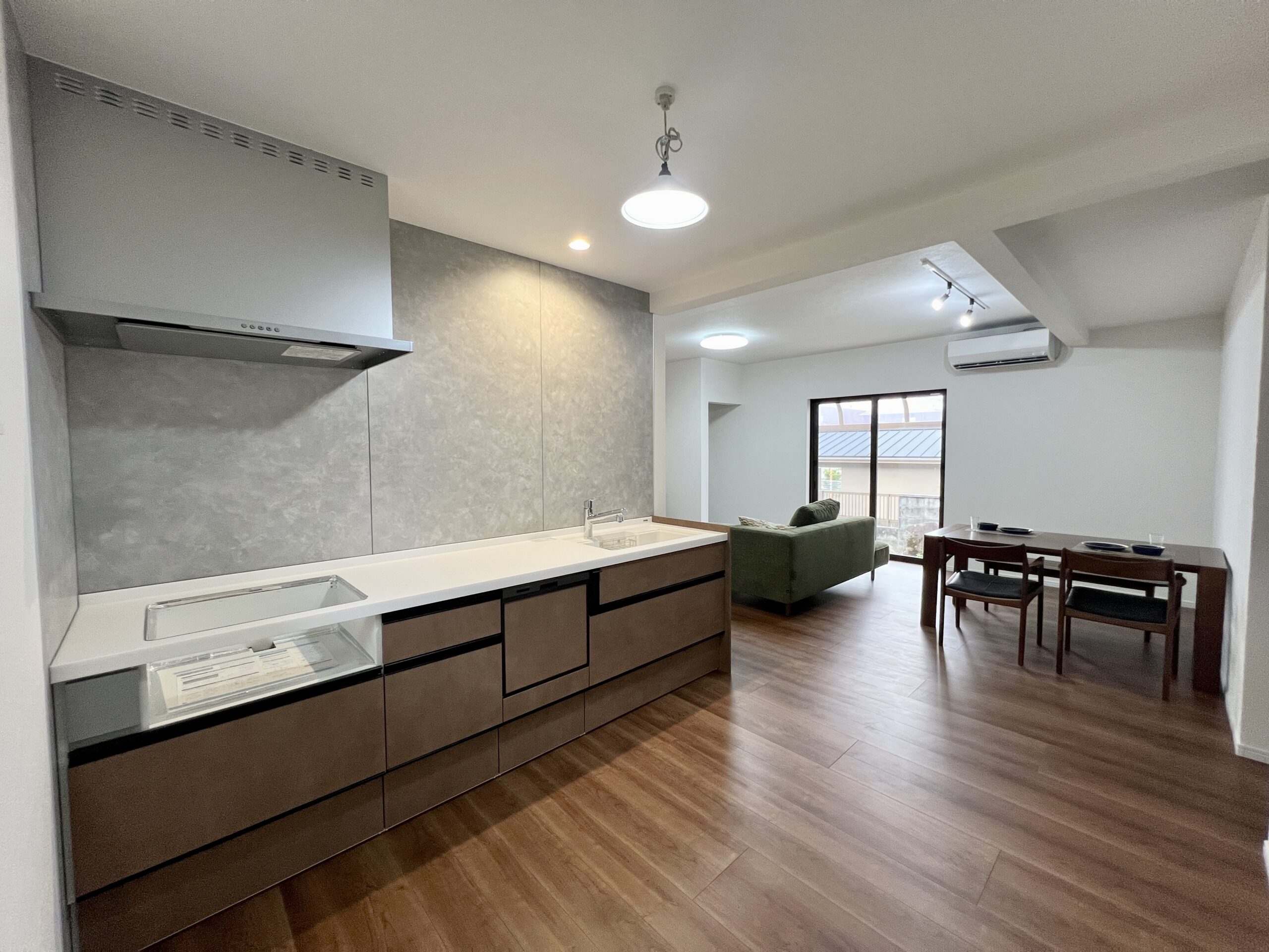 木目フロアにスタッコグレーのキッチンパネル、トッコアンティーク色のキッチンを合わせ、